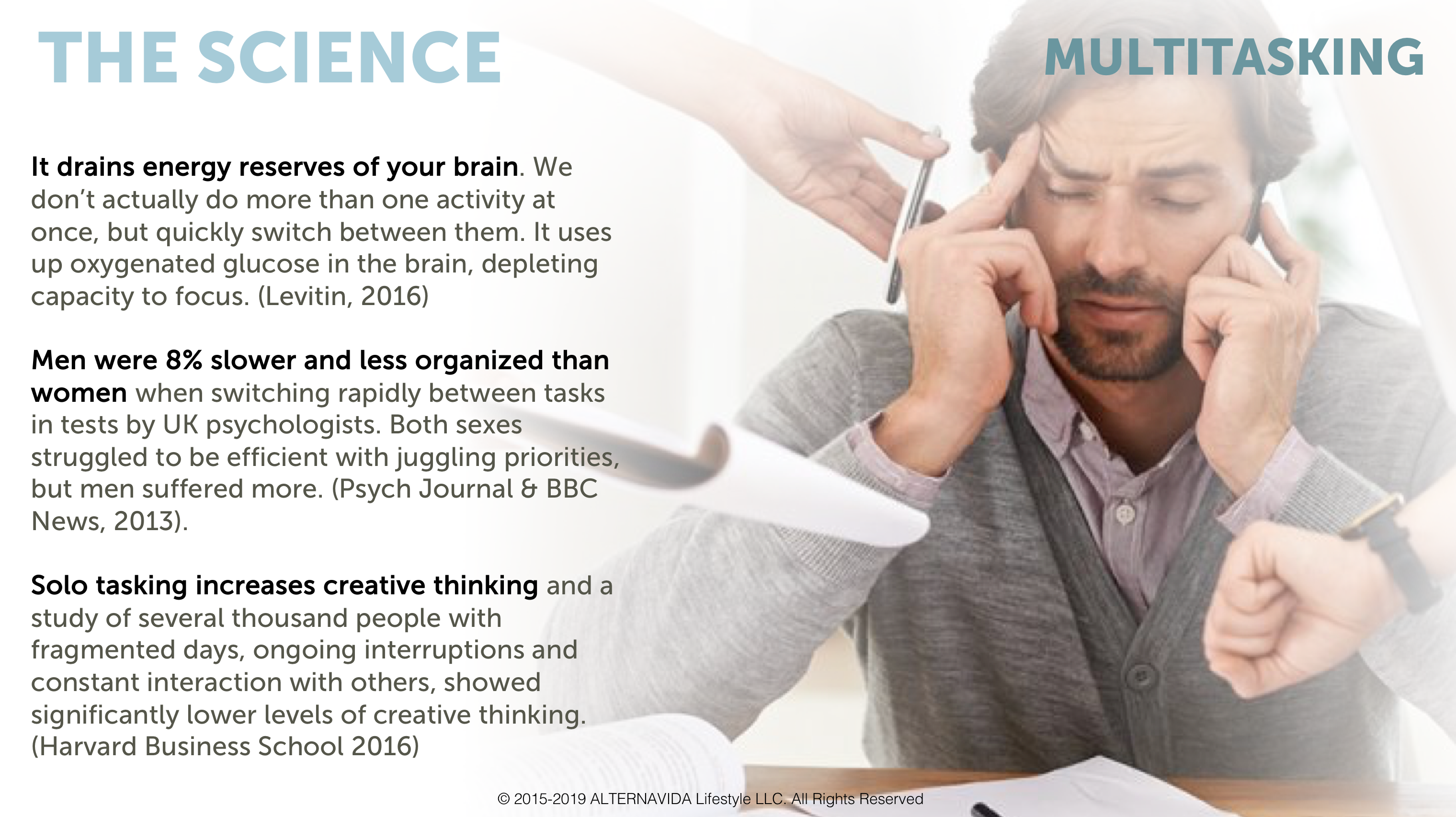 Shift from multi-tasking to solo tasking. Studies show that being “present” is a way of solo tasking with yourself or another person without thinking about anything other than the current moment, not even the past or future. When we are projecting out into the future or getting hung up on something from the past, so much information goes unnoticed. Remember, your central nervous system only has so much capacity so it is important to be aware of what is taking up most of the space within your system.