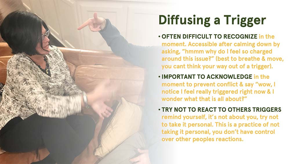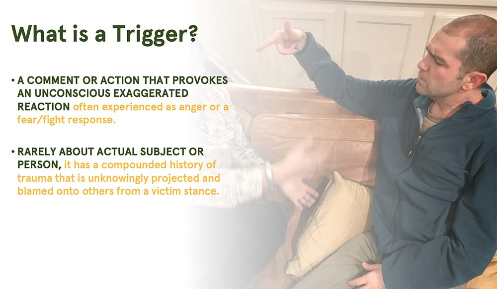 Triggers can knock us sideways. Something happens and we "go off." Literally, it's like something went ka-boom inside us. We rarely create a pleasurable, productive experience out of being triggered. Usually all we do is deepen a fear or entrench ourselves and someone else more firmly in a position.
